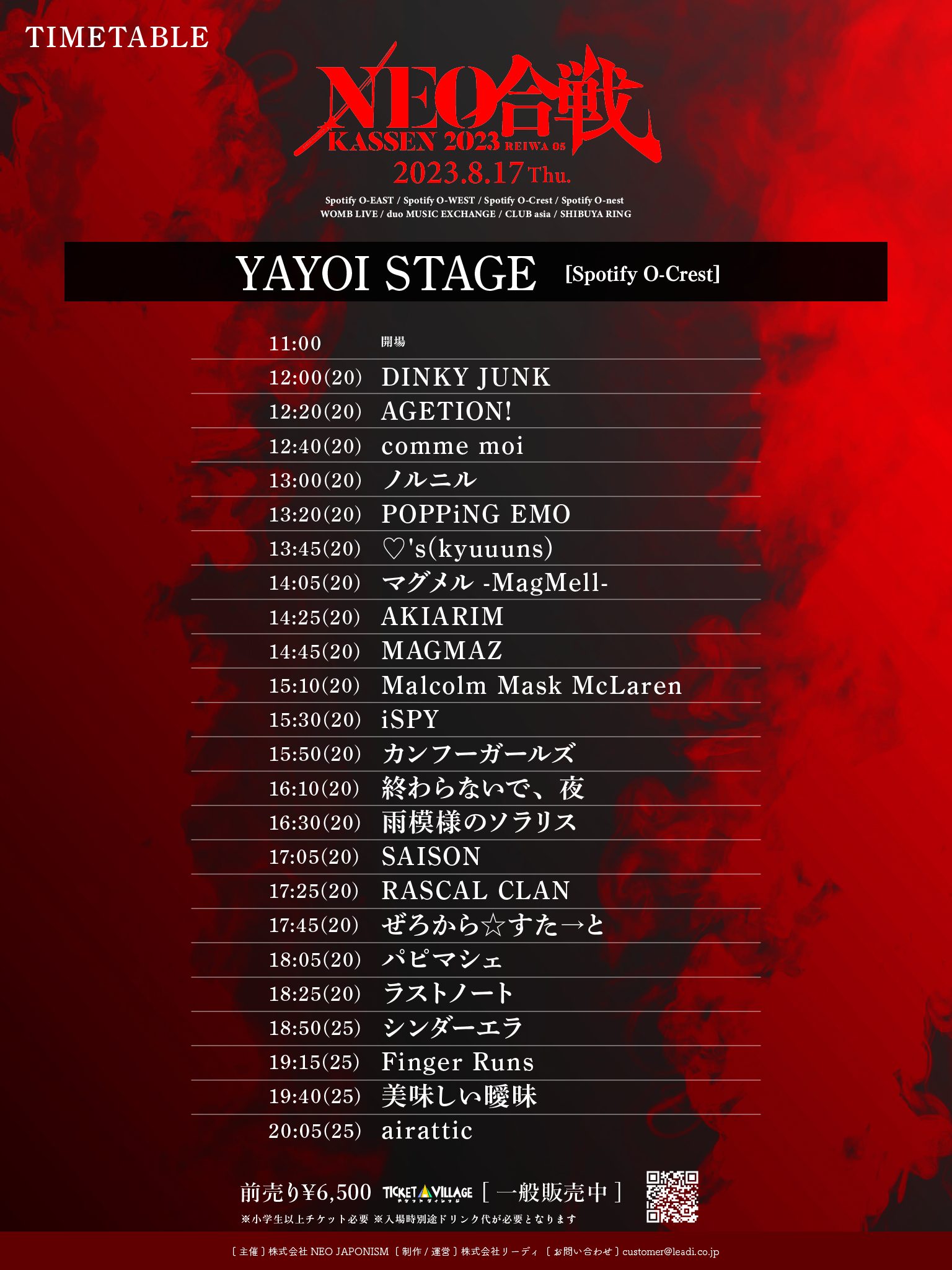AVAM / Axelight / 終わらないで、夜 / Quubi / C;ON / Sharply♯ × Flutter♭ / JYA☆PON / シュレーディンガーの犬 / シンダーエラ / すてねこキャッツ / 太陽と踊れ / Chick-flick / twinpale / 月夜に唄え / TELLMIT / TENRIN / NARLOW / にっぽん!真骨頂 / HACK / feelNEO / Finger Runs / ×純文学少女歌劇団 / PLEVAIL / PRSMIN / Payrin’s / マーキュロ / マグメル-MagMell- / Malcolm Mask McLaren / MIGMA SHELTER / Merry BAD TUNE. / yosugala / ラナキュラ