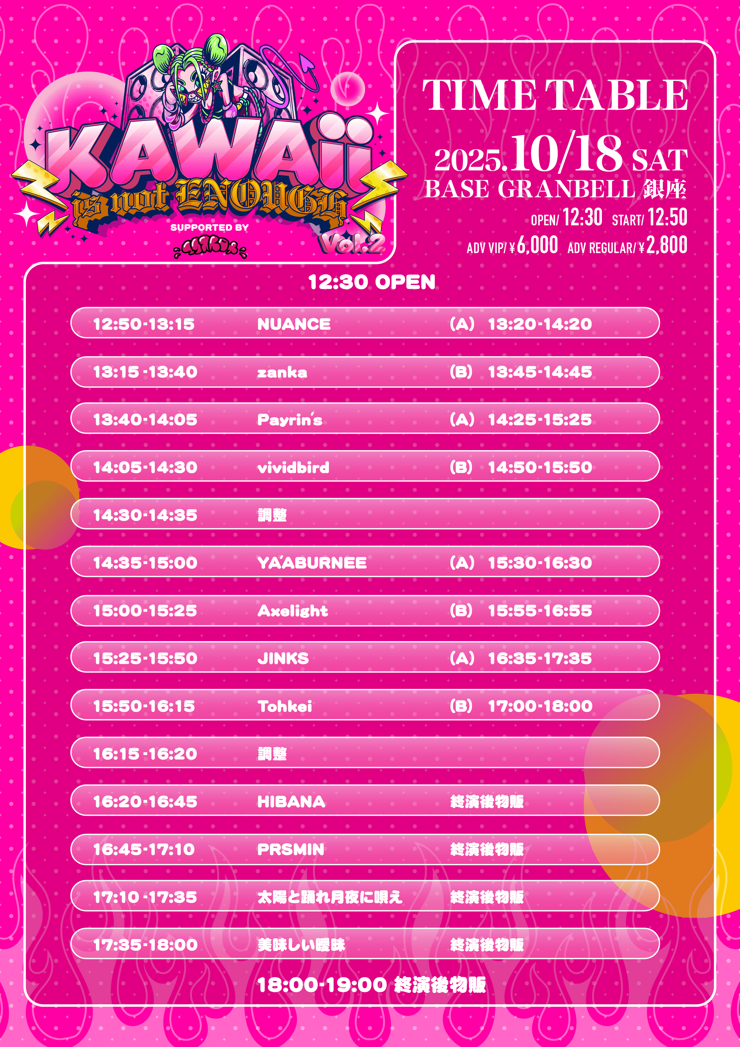 美味しい曖昧 / Tohkei / Payrin’s / YA’ABURNEE / HIBANA / NUANCE / PRSMIN / 太陽と踊れ月夜に唄え / zanka / vividbird / Axelight / JINKS