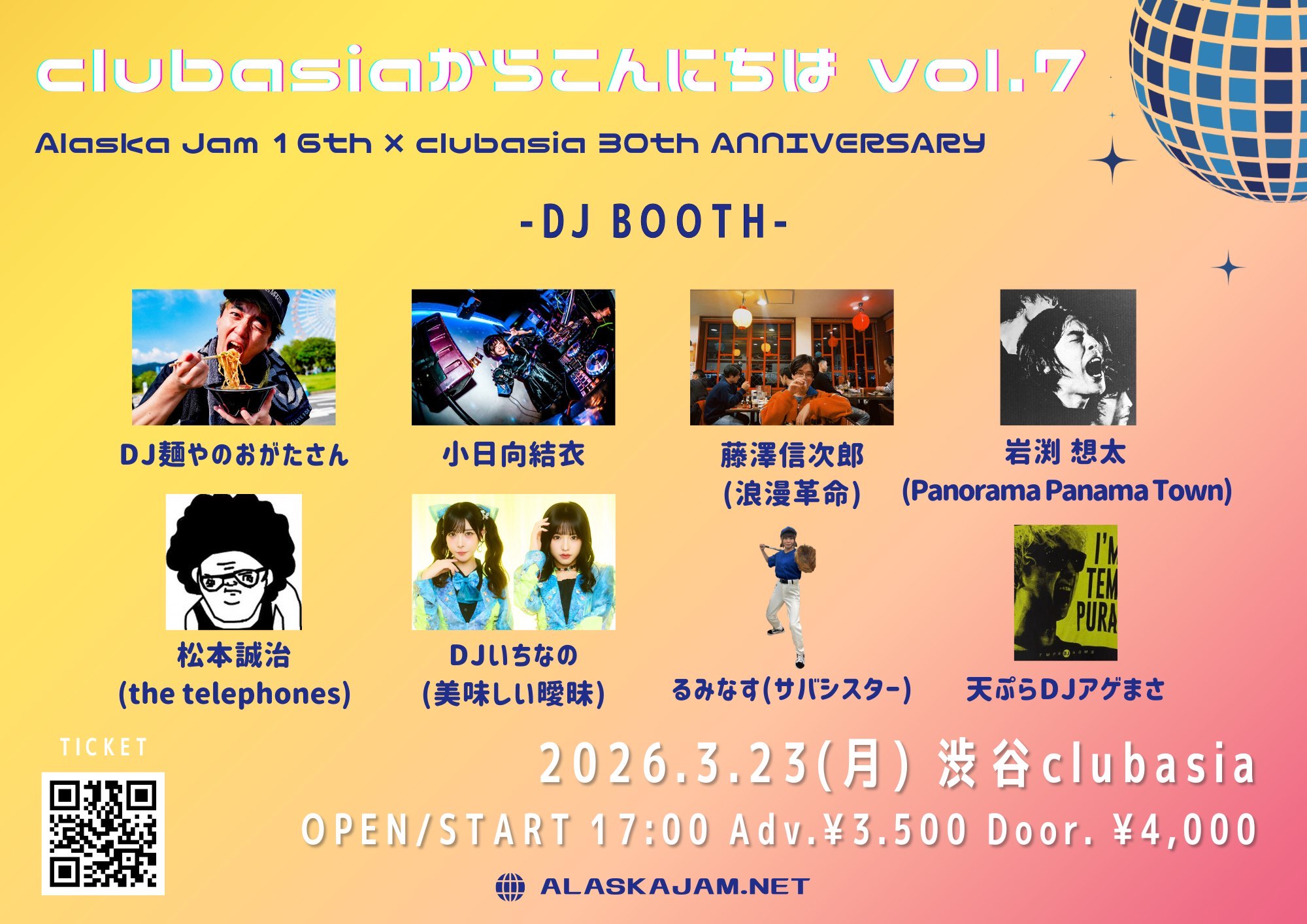 〈DJ〉DJいちなの(美味しい曖昧) / DJ麺やのおがたさん / 藤澤信次郎(浪漫革命) / 松本誠治(the telephones/大宮BASE) / るみなす(サバシスター) / 岩渕 想太(Panorama Panama Town) / 小日向結衣 / 天ぷらDJアゲまさ
