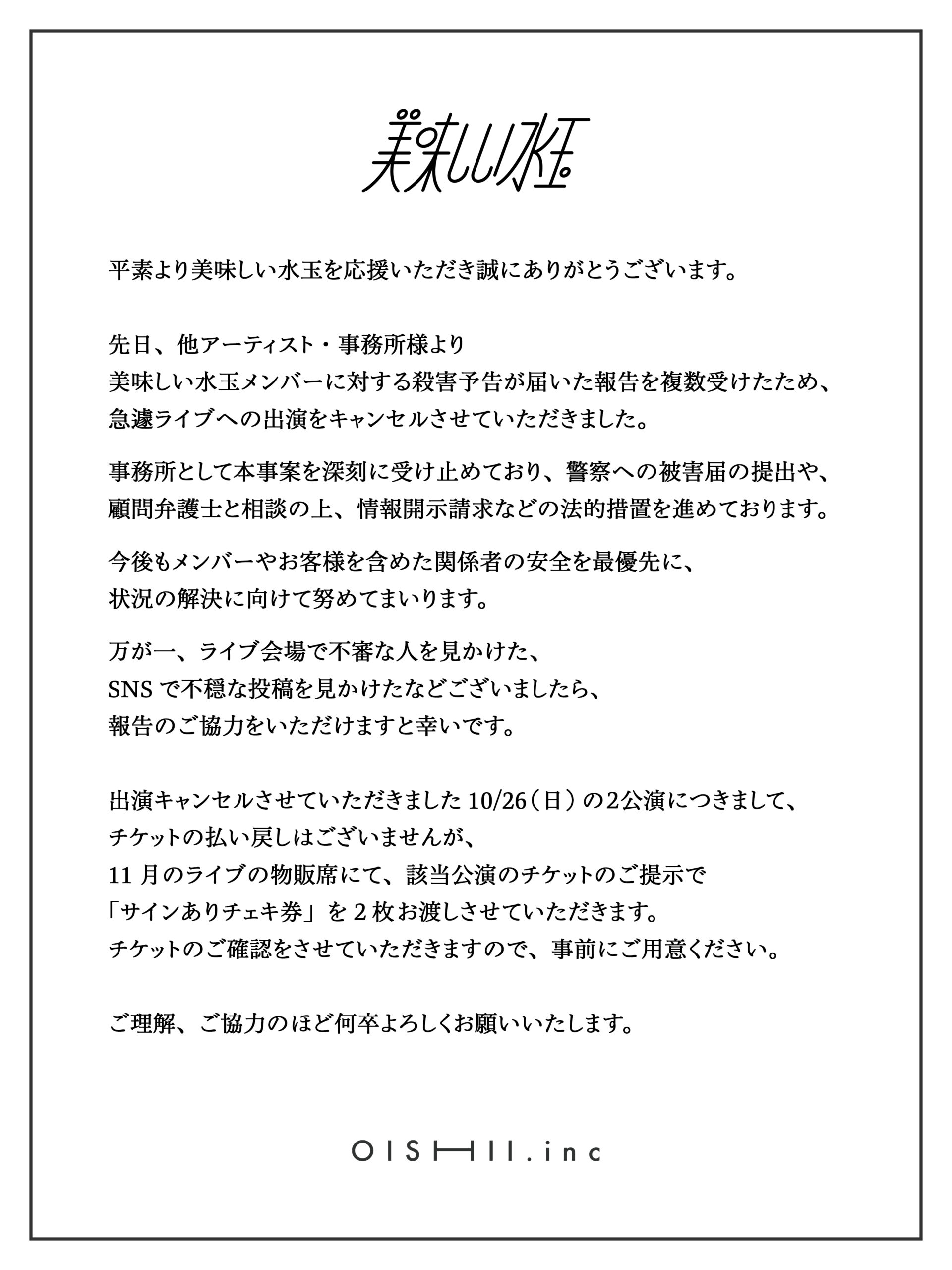 美味しい水玉メンバーに対する脅迫行為への対応につきまして